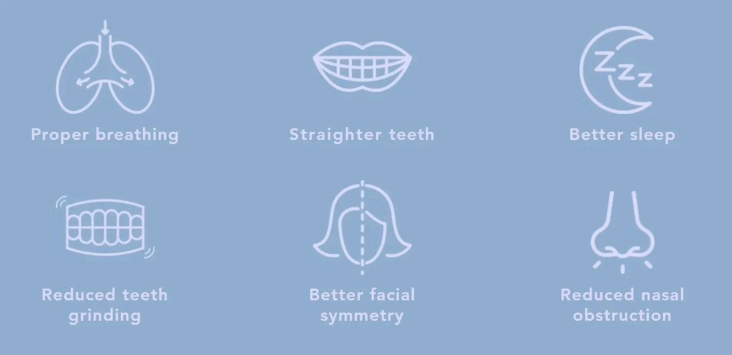 Proper breathing, reduction in teeth grinding, reduced nasal obstruction, reduction in sleep apnea episodes, straighter teeth, better facial symmetry, improved posture, better sleep, improved attention span, ability to move oral muscles properly, nail biting and other oral habits.